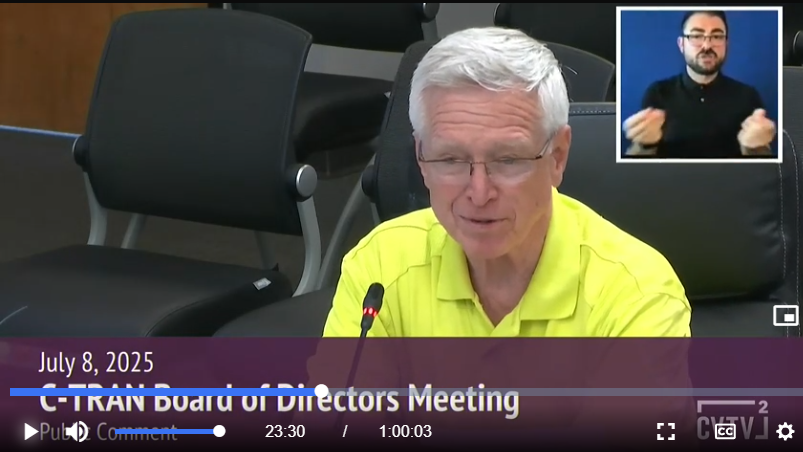 The July C-Tran Board of Directors meeting had several citizens asking the members of the board to NOT agree to TriMet’s demand that we pay over $7 million per year...